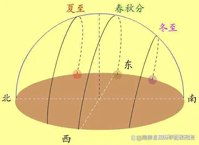 Chúng ta đều biết, do Trái Đất tự quay, Mặt Trời sẽ mọc ở phía Đông và lặn ở phía Tây trong một ngày. Quỹ đạo của Mặt Trời trên bầu trời trong một ngày là một hình bán nguyệt. Nếu không bị mặt đất che khuất, quỹ đạo của Mặt Trời trên bầu trời có thể được xem là một hình tròn hoàn chỉnh. Như hình: