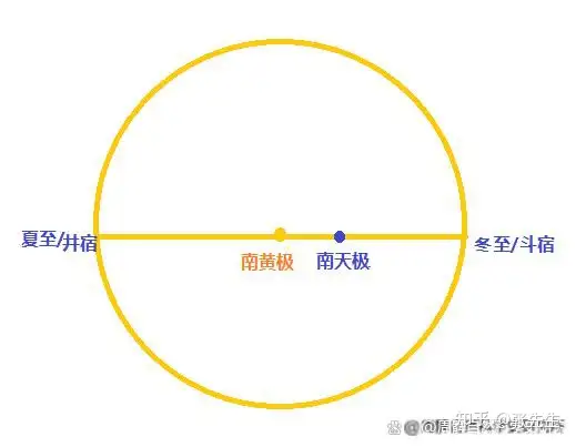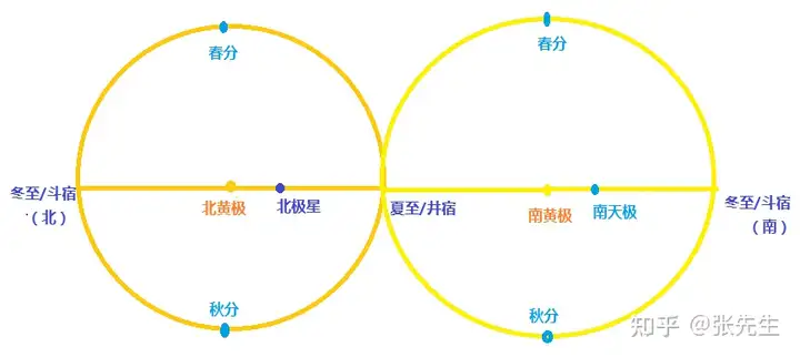 Chúng ta có thể thấy, khi ta hướng mặt về phía Bắc, Sao Bắc Cực/Thiên Cực ở gần Hạ Chí/Tỉnh Tú nhất, và xa Đông Chí/Đẩu Tú nhất. Nhưng nếu ta hướng mặt về phía Nam, trên cùng một đồ hình, Nam Thiên Cực sẽ gần Đông Chí/Đẩu Tú nhất, và xa Hạ Chí/Tỉnh Tú nhất.